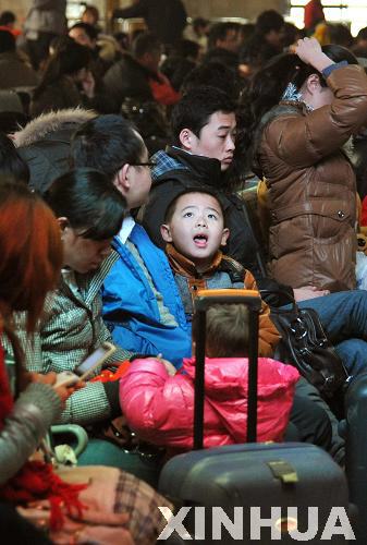 1月28日,在濟(jì)南火車站候車室,一名小朋友和家長一起等待上車。新華社記者 徐速繪 攝