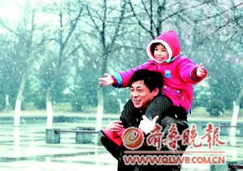 12日下午,濟寧城區一位市民帶著孩子在雪中玩耍。當日下午,濟寧市迎來立春后的首場降雪。 本報記者 李巖松 攝