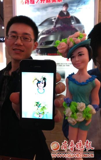 ②一位小伙子特意按照女友的照片定制了一對價格不菲的“情侶面塑”,惹來不少市民圍觀。 本報記者 孫國祥 吳凡 韓杰杰 攝影報道