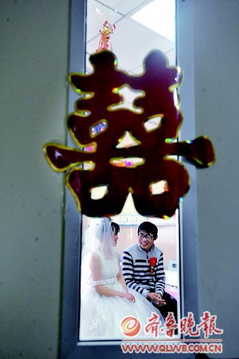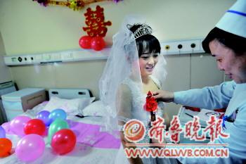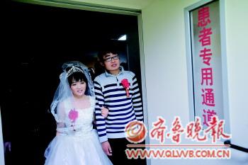 主持人問:“無論貧窮、富有,健康、疾病,你都愿意嫁給他么?”新娘李海麗堅定地回答:“我愿意!”2月14日情人節,位于濟南的省千佛山醫院病房里舉行了一場特殊的婚禮。新郎五蓮男孩身患尿毒癥,新娘與他相戀四年多,是位菏澤女孩。由于家庭貧困,男孩想放棄治療,為增強男孩與病魔抗爭的信心,女孩在情人節與他舉行婚禮,兩人的結婚戒指是男孩用金色的紙疊的。