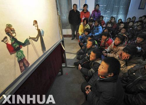 3月2日,山東省棗莊市山亭區宋莊小學學生在觀看皮影戲《雷鋒的故事》。 (李宗憲 攝)