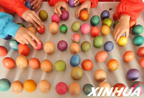 3月20日,山東省棗莊市紅旗小學(xué)幼兒園的小朋友在玩“立蛋”游戲。新華社發(fā)(孫中喆 攝)