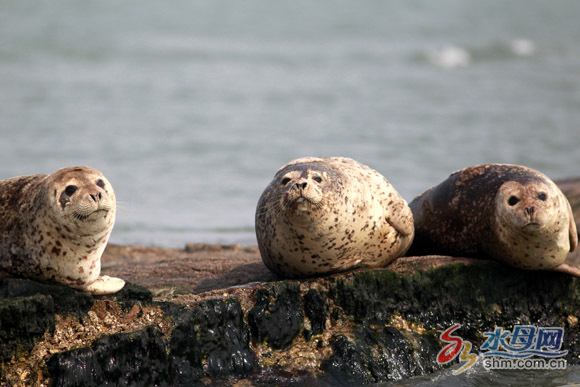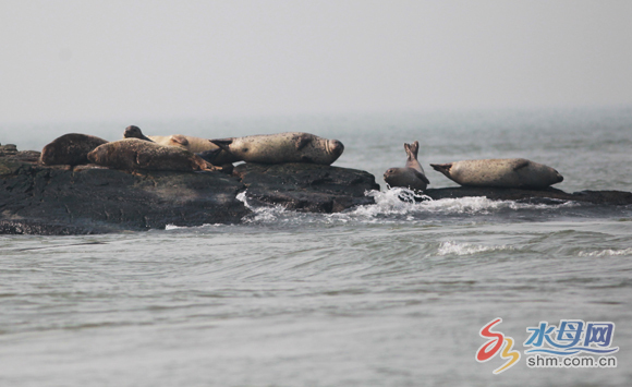 果然,隨著漁船慢慢靠近,記者能清晰地看到礁石上的海豹,兩塊大礁石加起來上面有20多只。我們距離海豹50米左右時,海豹群開始躁動起來,它們緩緩地抬起頭審視著“不速之客”。有些小海豹開始跳進(jìn)海里,過一會兒偷偷地再露出頭來警覺地觀察我們,而幾頭白色的老海豹卻很少理睬我們,最多也就抬抬眼皮,然后繼續(xù)享受“日光浴”。
