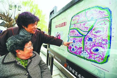 昨天,市民滿女士推著85歲的母親在曲水亭街北首瀏覽一幅充滿童趣的“泉水景觀導游圖”。據了解,這幅導游圖出自一名孩子之手,它用兒童獨特的視角描繪出曲水亭街周邊十余處泉水景點的方位,并配以富有童趣的插畫,讓游客耳目一新。 (記者 崔健 攝)