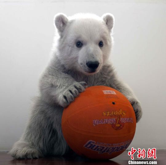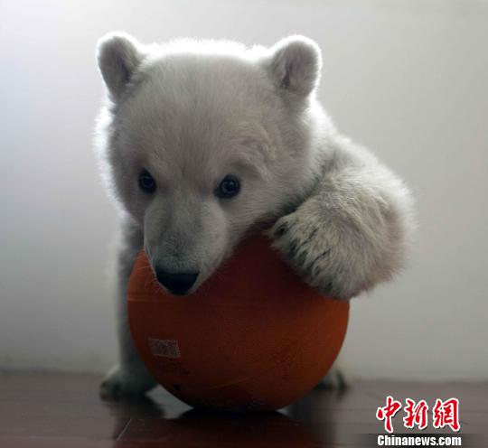 小北極熊今年元月1日在此間出生,名字暫定為元元。小北極熊的養育員“張媽媽”介紹說,別看元元是個小丫頭,但非常淘氣多動,跟個一歲左右的小孩子十分像。無聊的時候元元最喜歡抱著心愛的小皮球滿地打滾,或者趴在凳子上翻跟頭。如果自己玩膩了,就兩只手抱住保育員的腿,央求保育員們跟它一起玩。元元還是個特別怕寂寞的“小姑娘”,有時候“張媽媽”稍微離開一小會兒,她就會沒有安全感地大聲叫,讓人離不開她。