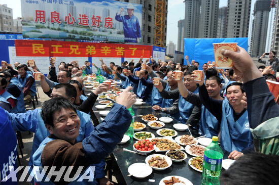 5月1日,來自四川的工友們在工地上舉杯慶祝勞動節(jié)。 當日,中鐵二局建筑公司青島項目部在工地設(shè)宴款待奮戰(zhàn)在施工一線的工人們,共同慶祝“五一”勞動節(jié)。據(jù)了解,由于他們承擔的項目工期緊、任務(wù)重,為不影響整個工程進度,許多建筑工人放棄了休息時間,主動請纓堅守崗位。 新華社記者李紫恒攝