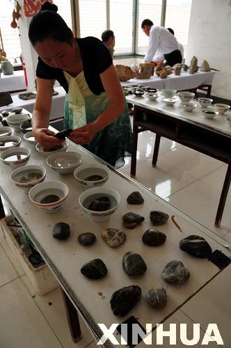 5月18日,山東省郯城縣馬頭鎮農民徐連勤在“農家博物館”整理象形石頭。(房德華 攝)