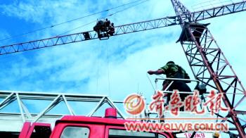 高達15米的塔吊上,一名正在操作機器的男子被鋼絲纜繩擊暈,當場昏倒在塔吊橫梁上。26日中午,在經區泊于鎮寨子東村北海邊一養殖場碼頭上,經區消防大隊動用舉高車,成功解救下這名男子。