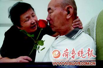 12日中午,在經濟開發區天安怡園小區,66歲的李桂英拿鮮花逗輪椅上的老伴開心。她70歲的老伴高興山20年前患上帕金森病,自從丈夫患病,她毅然決定提前退休,20年如一日形影不離地照顧。