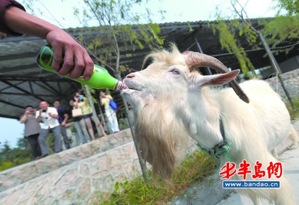 為了吸引游客,農場特別培養了一只能喝啤酒的山羊,一次能喝4瓶啤酒。