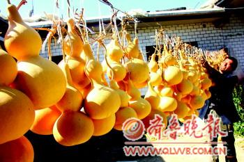 東昌府區(qū)堂邑鎮(zhèn)路莊村是遠近有名的葫蘆村,村子里幾乎家家戶戶都種葫蘆,每年農(nóng)歷七八月份,是葫蘆成熟的季節(jié),一走進村子,滿眼都是成串成串的葫蘆,在各家的晾衣繩上曬著。