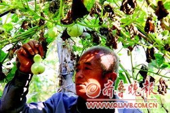 村民老路介紹,摘葫蘆是件費勁的事,要用剪刀剪斷葫蘆藤,葫蘆上至少要大概5厘米的藤,這樣摘下來的葫蘆才能賣個好價錢。