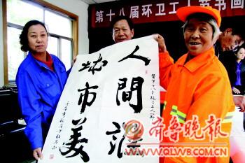22日,奎文區環衛處禮堂內歡聲笑語,墨香飄溢,6位書法名家齊聚在此,為環衛工現場揮毫。記者了解到,第十八個“山東省環衛工人節”即將來臨,書法家們用贈送書畫的方式表達對環衛工人的關心和祝福。當日,共有40名環衛工人收到書畫。