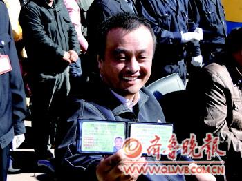 10月31日,“德州市首批殘疾人駕駛證發證儀式”在平原華達駕校訓練場舉行,學員王學永拿到駕駛證后十分開心。 通訊員 郝建忠 攝