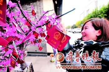 11月6日,泉城路上,一棵“開”滿桃花的樹上掛滿“脫光證”。這是一商家特地為光棍節制作的“求脫光”樹,年輕人可將自己的資料寫在“脫光證”上,掛在樹上求一段戀情。