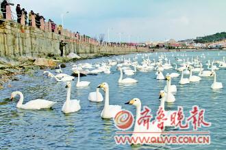 7日,在榮成市俚島鎮煙墩角村,從西伯利亞遠道而來的大天鵝正聚集在湖面上嬉鬧捕食。榮成天鵝湖保護管理站工作人員說,截至目前,已有5000余只大天鵝陸續抵達榮成天鵝湖,它們將在這里避寒、捕食,直至明年三月中旬左右離開。本報記者 王震 攝影報道