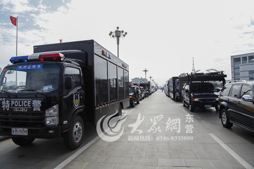 大眾網東營7月10日訊(記者 吳業昌)10日下午,山東17地市的特警在東營市東營區政府大樓前集結。下午5時,主持人宣布山東省公安特警跨區域拉動演練活動彩排開始,濟南、東營、泰安、濱州等地市分別在場地演習特警出警任務。