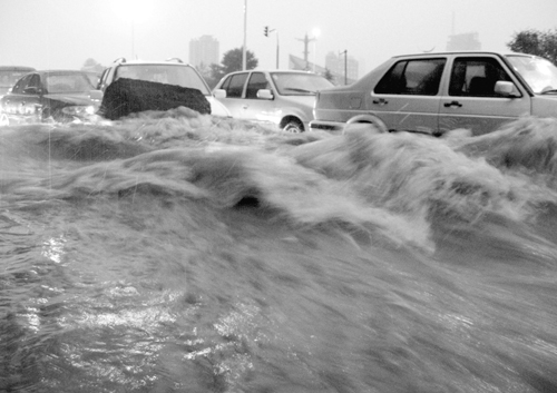 在濟南市馬鞍山路上拋錨的汽車(7月18日攝)。7月18日傍晚,一場強暴雨襲擊濟南市!跣氯A社發
