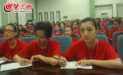 大眾網7月16日濟南訊(記者 陳宏發) “一、一、一……”早上,在山東旅游學院的教室里,學生正在認真地上課,這不是普通話課,也不是音樂課,而是全運會頒獎禮儀志愿者培訓課,學生們正在練習微笑時的口型。今天是她們第一次開課,來自14所駐濟高校的223名將在此接受為期一個月的封閉式訓練,參照北京奧運會培訓標準,向全國人民展示山東人最美的一面。