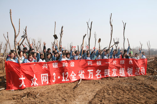 據悉,大眾網“領養一棵樹苗  同植一片綠色”——312全省萬名網友大型植 樹活動從11日起在全省拉開序幕,日照、淄博、煙臺、棗莊、青島、萊蕪等十七地市網友將陸續開展植樹活動,一直持續到14日,共有1.2萬余名網友參與到這個 大型活動中來,為山東省添綠萬株。濟南市共有三個植樹點,分別是西郊森林公園、臘山公園、長清區三慶公社,屆時,廣大網友將隨身攜帶心形卡片和小繩,寫上自己的姓名和寄語,掛在自己親手種植的小樹上,“領養”這棵樹苗。此外 ,共同前往的夫妻、情侶可共植“同心樹”、“愛情樹”,帶著孩子的還可以共 植“父子樹”、“母子樹”等。