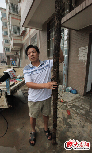 在受災最嚴重的9號樓二單元,一些居民七手八腳的抬來一根長木頭測量水深。當木頭抬出水面時,大家才發現水位痕跡比一人都高,水深足有2米。