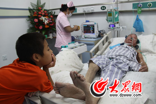11日上午11點,在省胸科醫院東院的ICU病房,病區李護士長正在用小勺刮著蘋果喂鄭老吃,兩名11歲的男孩伏在病床邊竊竊私語,他們都是鄭老收養的孩子。