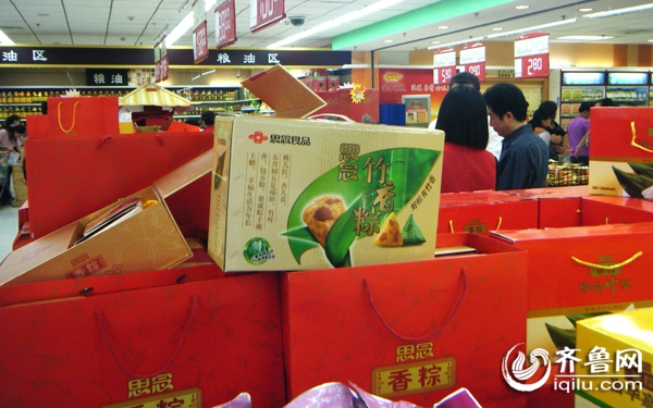 濟南某超市粽子專柜前,包裝精美的粽子。 于鵬 /攝影