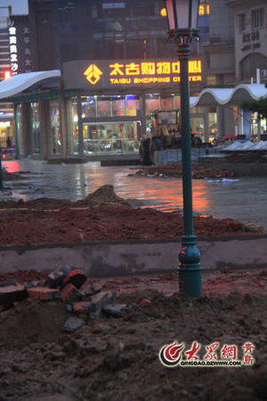 青島太古百貨地下購物中心上層地面到處堆積著建筑垃圾
