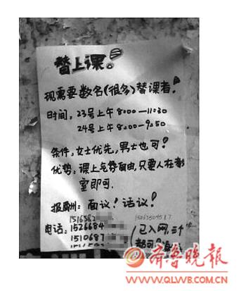 [提要] 學(xué)生在宣傳欄上貼出的征人代替上課的廣告。“平時(shí)我們找替課的少,學(xué)校查得不嚴(yán)的話,我們可以請(qǐng)假或者逃課。”她說,學(xué)生到了大四逃課的是不少,“但是考慮到學(xué)生也是為了好的前途,就比較理解,多數(shù)老師也不忍心太為難他們。