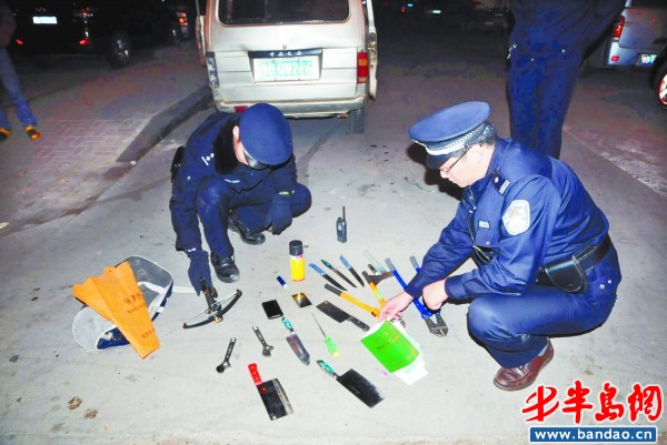 黃島警方從嫌疑人車上搜出斷線鉗、菜刀等作案刀具。