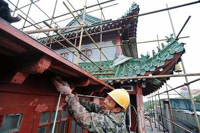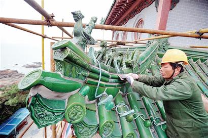 昨日下午,記者在萊陽路的青島水族館看到,鑲嵌了綠色琉璃瓦的水族館建筑周圍已經搭起腳手架,多名施工人員正在樓頂施工。記者登上樓頂看到,水族館木質構件上的彩繪部分斑駁脫落,很多漆面龜裂翹起。“這個地方緊靠著海邊,潮濕的海風對木結構和表面油漆腐蝕嚴重。”施工人員告訴記者,水族館保養修繕近日剛開始動工,他們首先要去掉一些龜裂的油漆表層,對海風腐蝕的脫落凹陷部分補刮膩子,再重新補刷漆面。“屋頂的琉璃瓦也得挨個檢查,看看有沒有松動、破裂的。”施工人員表示,青島水族館是文物保護單位,他們在保養修繕時將按照修舊如舊的原則,最大程度地保護建筑原有風貌。