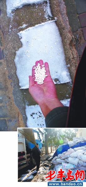 ▲記者用兩種融雪劑進(jìn)行實(shí)驗(yàn) ,整個(gè)過程沒有聞到那種怪味。 ▲市南區(qū)環(huán)衛(wèi)清潔總公司內(nèi)堆放的融雪劑