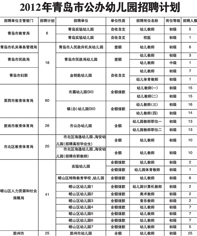 根據青島市公布的2012年事業單位招生簡章統計,青島市今年招聘帶編制的工作人員196名,其中包括195名幼師和1名校醫。