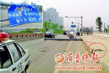 [提要] 22日早上7時(shí),在西客站齊魯大道與清源路交叉口,一大型交通指示牌桿被撞倒,其底座被連根拔起,肇事車輛逃逸。現(xiàn)場勘察組根據(jù)肇事車與指示牌接觸高度分析,肇事車應(yīng)該是一輛卸完渣土后,后斗未按照操作規(guī)定放平上路行駛而肇事。