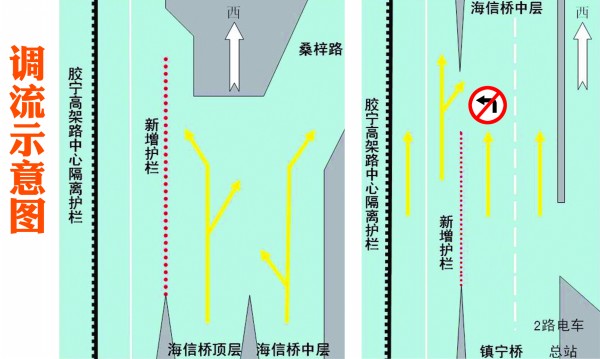 在此次試驗(yàn)調(diào)流中,膠寧高架路的東向西方向,從紅領(lǐng)立交橋上橋口(即寧夏路東向西方向經(jīng)南京路上橋)一直到鎮(zhèn)寧立交橋外側(cè)車道上橋口(怡情樓酒店附近),在這一段道路上內(nèi)外側(cè)車道之間的隔離護(hù)欄全部拆除,允許沿徐州路、連云港路北向南行駛右轉(zhuǎn)進(jìn)入高架路的車輛,以及沿寧夏路東向西行駛上橋的車輛,沿外側(cè)車道變道進(jìn)入內(nèi)側(cè)車道行駛。