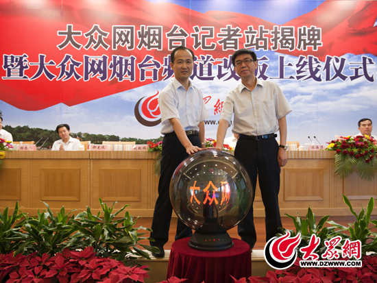 大眾報業集團黨委常委、副總編輯郝克遠(右)與煙臺市委宣傳部副部長陳海濤(左)按下水晶球開通新版大眾網煙臺頻道