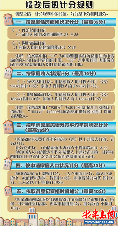 早在今年1月初,青島市國土資源和房屋管理局就發布《青島市經濟適用住房和限價商品住房輪候排序計分規則(征求意見稿)》,面向社會公開征求意見。擬對現行的經濟適用住房和限價商品住房輪候排序規則進行調整,將市區(市轄七區和高新區)經濟適用住房和限價商品住房銷售中的電腦搖號方式調整為綜合計分排序方式,依申請家庭得分高低排序選房。