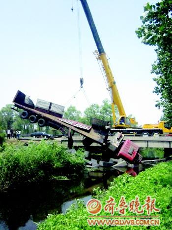 本報(bào)濟(jì)南7月1日訊(見習(xí)記者 劉帥) 1日早上7時許,在濟(jì)青高速公路上一輛載重十多噸的大貨車突然翻入路邊河溝,所幸此事故并無人員傷亡,但由于貨車太重,經(jīng)過4小時緊張救援,才把貨車吊出。據(jù)悉,發(fā)生車禍的原因可能是司機(jī)疲勞駕駛。