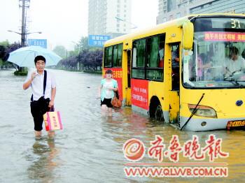 8日上午,臨沂37路公交車在嚴重積水的馬路上勉強行駛。 本報記者 王倩 攝