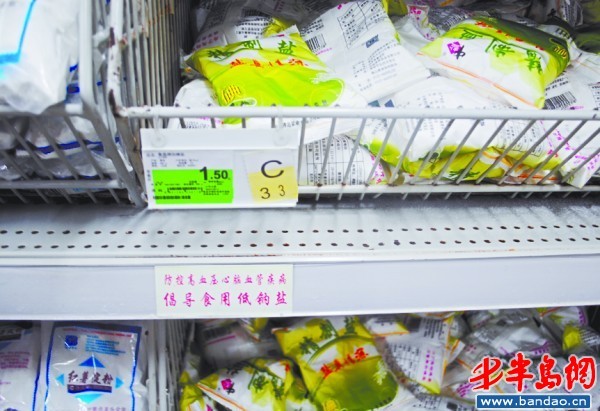 超市食用鹽貨架上貼有防控慢性病的溫馨提示。