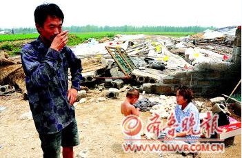 在坍塌的鴨棚前,顧興臣忍不住落淚,妻子傷心地癱坐一旁。本報(bào)記者 李巖松 攝
