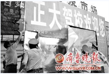 執法人員將黑駕校宣傳招生廣告牌揭下。齊魯晚報記者邱志強攝