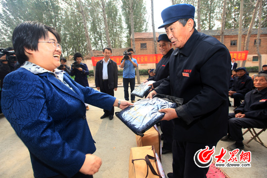 濟(jì)陽縣委常委宣傳部長李莉等為老人們捐贈愛心衣物(曹亮 攝)