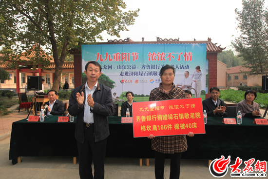 近年來,濟(jì)陽縣委、縣政府大力加強鄉(xiāng)鎮(zhèn)敬老院的建設(shè),老人們的生活環(huán)境和生活質(zhì)量有了很大改善 ,濟(jì)陽縣縣委常委、宣傳部長李莉在致辭中說,養(yǎng)老敬老事業(yè)既是黨委政府義不容辭的責(zé)任,同時也是一項社會公益事業(yè),只有廣泛動員社會力量踴躍參與,才能真正實現(xiàn)老有所養(yǎng)、老有所依的目標(biāo)。她希望,社會各界以齊魯銀行和大眾網(wǎng)、山東公益為榜樣,積極為養(yǎng)老敬老公益事業(yè)增磚添瓦、奉獻(xiàn)愛心,為 構(gòu)建和諧濟(jì)陽做出貢獻(xiàn)。