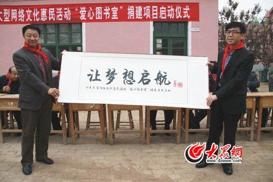 隨著一幅《讓夢想起航》的書法被山東省新聞出版局副局長楊樹國和大眾報(bào)業(yè)集團(tuán)黨委常委、副總編輯郝克遠(yuǎn)共同展開,“山東省大型網(wǎng)絡(luò)文化惠民活動愛心圖書室捐建項(xiàng)目啟動”正式啟動。記者 張帆 攝