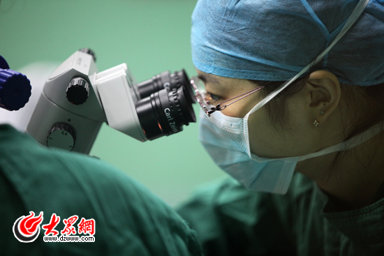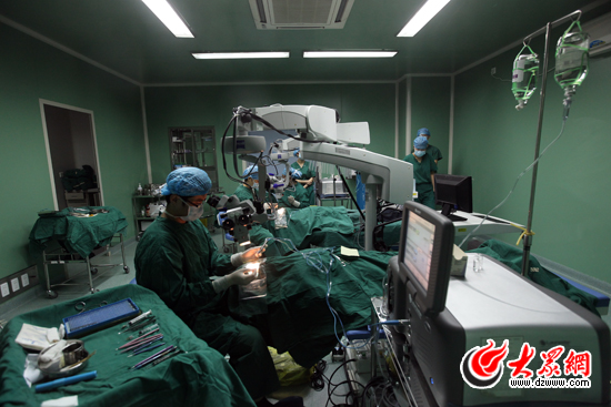 今天上午9:30,手術開始,手術室內兩臺手術同時進行。大眾網記者隔著玻璃看到,在完成最后一次消毒沖洗后,患者被扶到手術臺上。頭部包好治療巾后,兩名主刀醫生相互配合同時為一名患者做手術,醫生使用一臺大型的電子觀察儀器來精確查看患者眼部的細微變化。手術進行順利,有的患者的手術僅用10分鐘左右就完成了。患者做完手術后,被護士攙扶著回到病房,并向患者和家屬交代一周內在飲食、起臥等方面需要注意的事項。
