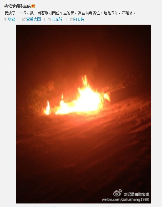 陳寶成的微博截圖,他在微博中說:“我燒了一個汽油瓶,當著剛才兩位車主的面,旨在告訴各位:這是汽油,不是水。”