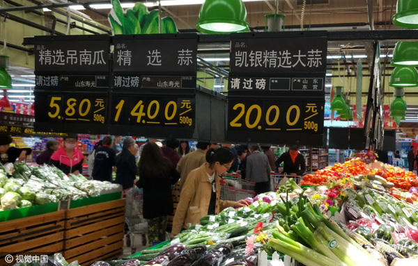 濟(jì)南一家大型超市里,兩家賣蒜的柜臺(tái),一個(gè)是20元一斤,一個(gè)是15元一斤。就是便宜的蒜,4頭也需六塊多。圖片作者:視覺中國(guó)
