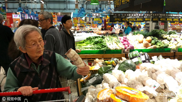 一位大媽買蒜拿起來看看又放下,就這樣猶豫了好幾分鐘也沒定下來買還是不買。圖片作者:視覺中國(guó)