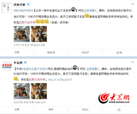網友@蔣慧馨K_爆料:自我感覺我們高中比他們可怕!14年冬天喝湯喝出老鼠頭,前天又驚現整只老鼠。謝謝食堂阿姨給學弟學妹加肉吃,學校是巨野大成中學。(來源:濟南日報)